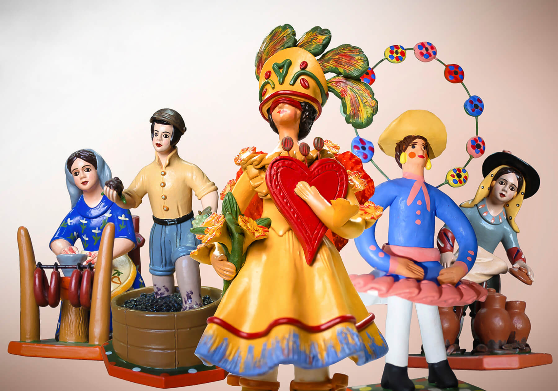 As mãos habilidosas que trabalham o barro dão vida aos emblemáticos Bonecos de Estremoz que, com as suas cores garridas, encantam quem por aqui passa e que são Património Cultural Imaterial da Humanidade. No século XVIII, os barristas foram dando forma a peças únicas e conhecidas internacionalmente, como o são exemplo os famosos Presépios de Altar, o “Amor é Cego”, a “Primavera”, os “Pucarinhos” ou, mais recentemente, o boneco “Rainha Santa Isabel”.
